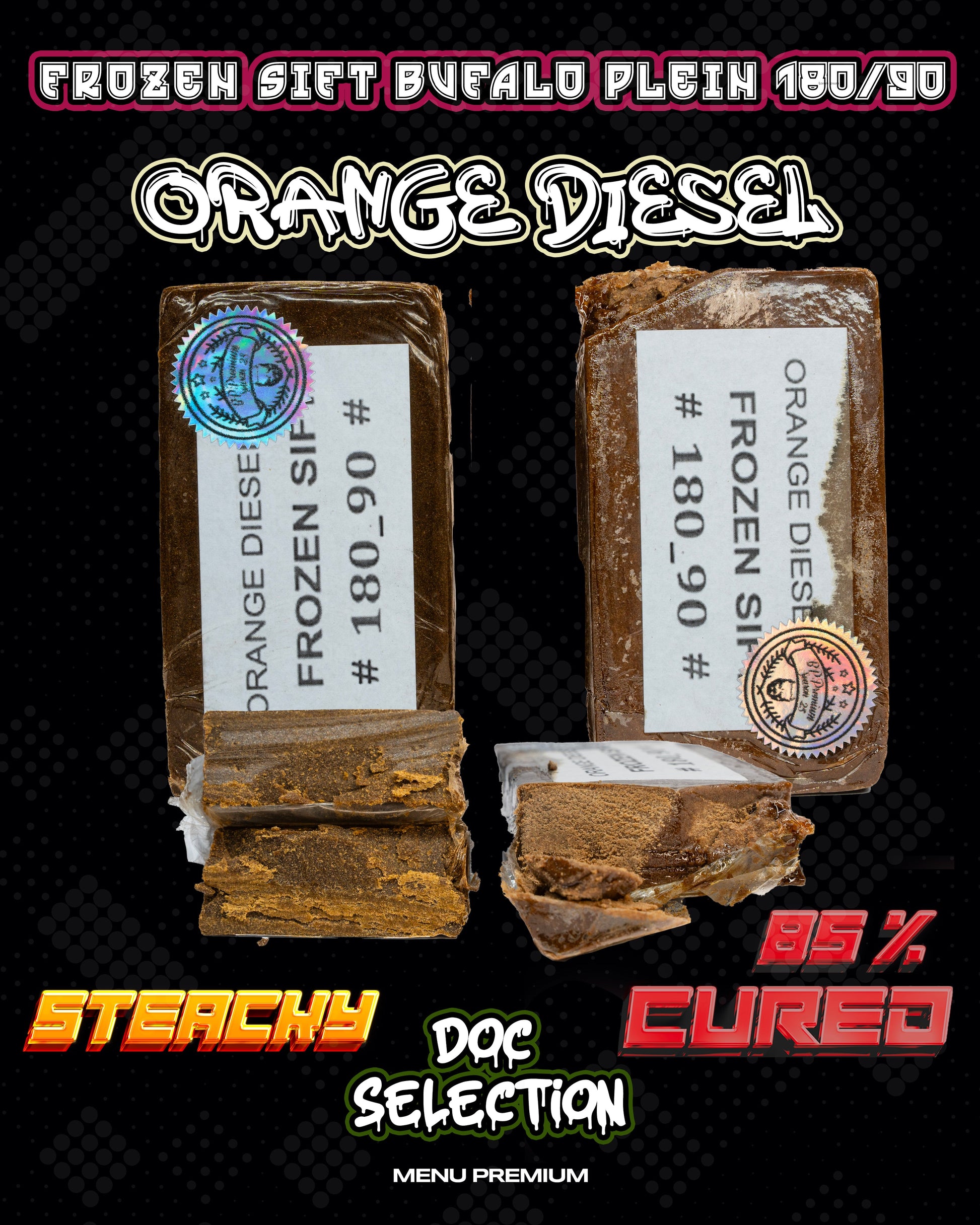 Β Linea frozen 180/90u di casa Bufalo Plein, hash filtrato con maglie 180/90u in cella frigo levando ben 300gr di scarto vegetale da un kg di polvere sana, polveri date da semi originali dello strain ORANGE DIESELΒ , questa categoria di prodotto Γ¨ consigliataΒ ai palati piΓΉ esigenti abituati a livelli di terpene alto che gia hanno esperienza e dimestichezza con alti contenuti di thc.Β